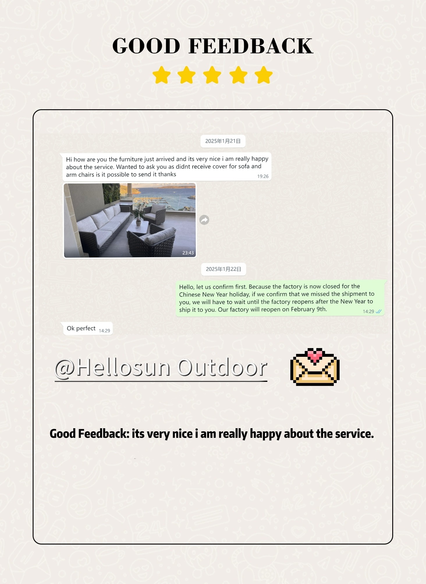 Website China outdoor furniture factory is well known for producing high-quality outdoor furniture. The company focuses on innovative and environmentally friendly designs, using materials such as aluminum, stainless steel and synthetic wicker to make high quality swing chair, outdoor sofa, chaise lounge and dining furniture. HELLOSUN furniture is exported all over the world and has become the first choice for consumers seeking stylish outdoor furniture.。